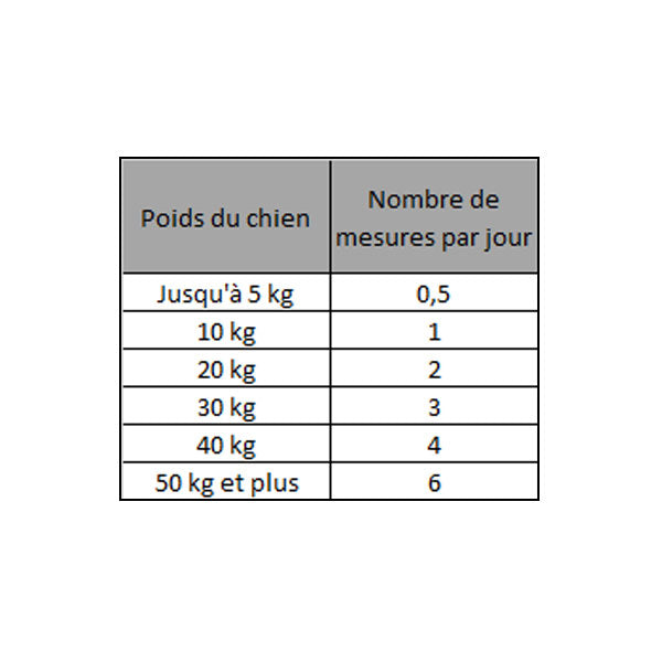 Add daily to food, splitting the required amount into two doses if possible. A 2.5ml measuring cup is included and full instructions are on the pack. Introduce slowly if your dog has not previously taken supplements. It is recommended to wait up to a month to see the full benefits. Over time, the amount given may be decreased. Animals are individual and a lower maintenance amount is often sufficient for long-term use. If you have any concerns about your pet's health, contact your veterinarian immediately.