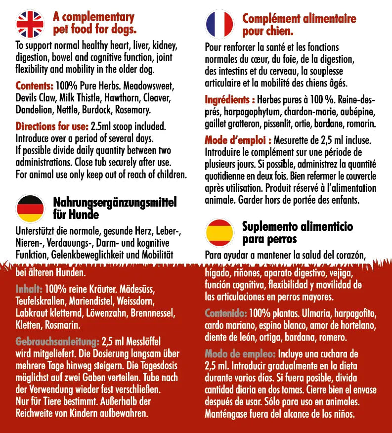 Senior Dog is a supplement containing finely chopped dried herbs such as hawthorn tops, devil's claw root and milk thistle seeds to provide comprehensive support for your senior dog.