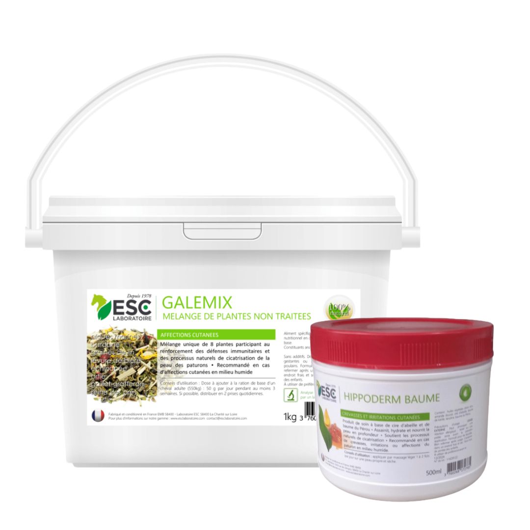 Pack pour lutter contre la gale de boue du cheval aussi bien de l'intérieur en drainant et en renforçant le système immunitaire, que de l'extérieur avec une crème spécifique à appliquer sur la zone lésée.