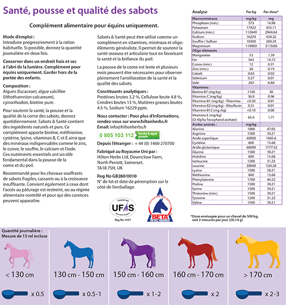 Le ricerche hanno dimostrato che una dieta equilibrata contribuisce allo sviluppo di zoccoli sani e al benessere generale. Ricordate che la crescita degli zoccoli è lenta, quindi chiedete al vostro maniscalco se nota dei miglioramenti. Zoccoli e Salute é è un integratore di minerali e vitamine per cavalli a base di alghe e rosa canina.